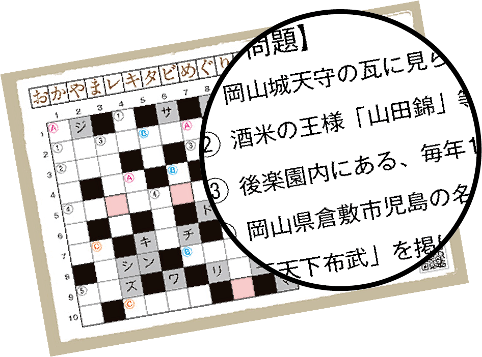 - ❷「岡山市の歴史」「室町~江戸時代」「秀吉」「宇喜多家」等に関係するクロスワードを解いてキーワードを見つける。